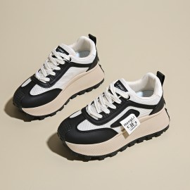 女性用ロートップカジュアルスニーカー、厚手のプラットフォームソールで身長アップ - ブラック&ホワイト合成カバー&メッシュアッパー、ラウンドトゥ快適性、EVAインソール&PVCアウトソール、オールシーズン万能アウトドアシューズ