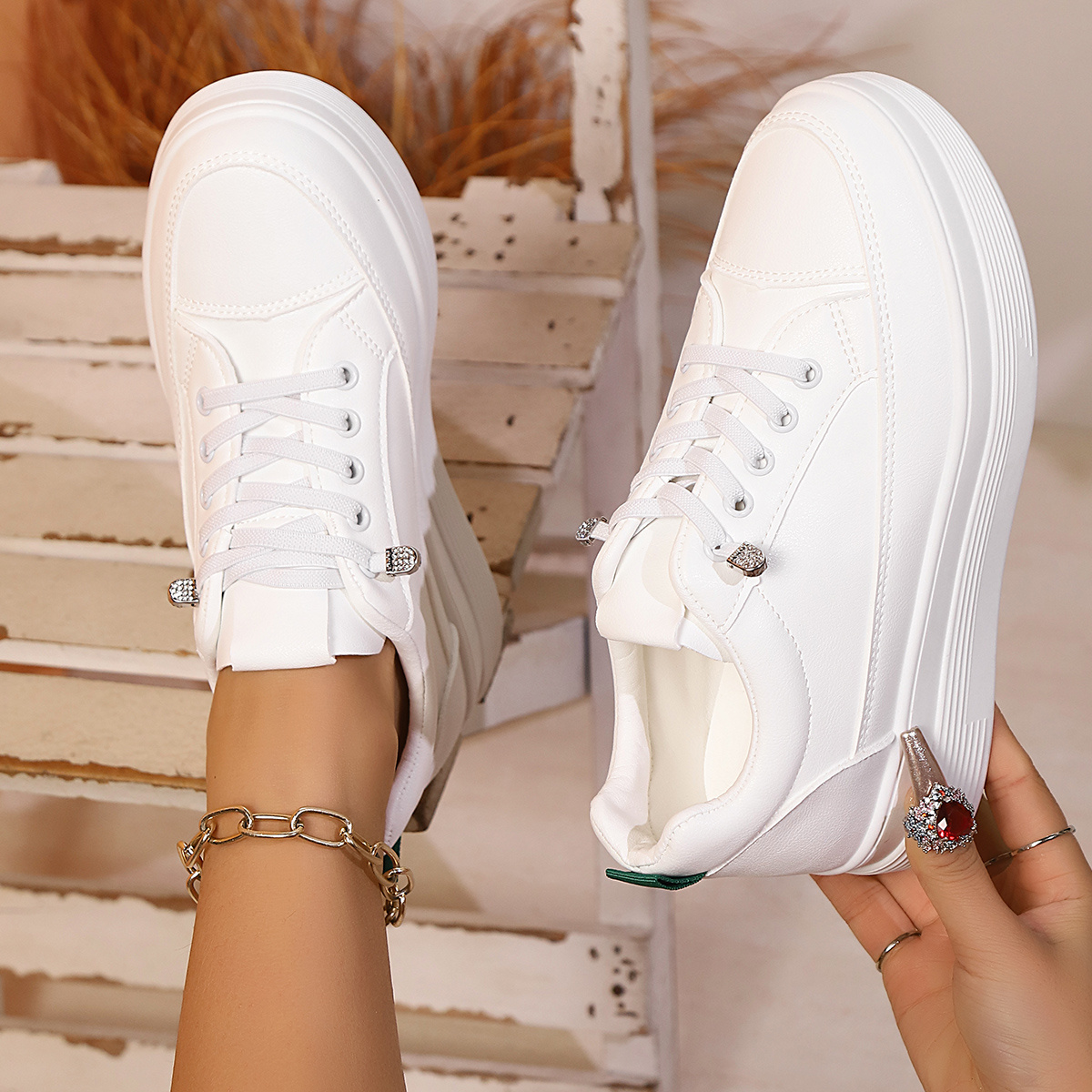 女性用ホワイトプラットフォームスニーカー - 軽量、高さを引き立てるロートップ、ラウンドトゥ&レースアップデザイン、フェイクカバーアッパー&PUソール、快適なオールシーズンカジュアルシューズ、カジュアルアティアシューズ | ファッションスニーカー | 生地裏地のスニーカー