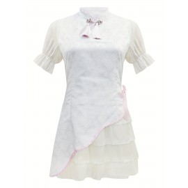 エレガントな新しい中国風チェンサムドレス、リボン付き - シュガーケーキスカートデザイン、半袖、マンダリンカラー、夏の女性ファッション、白色に黒い花柄