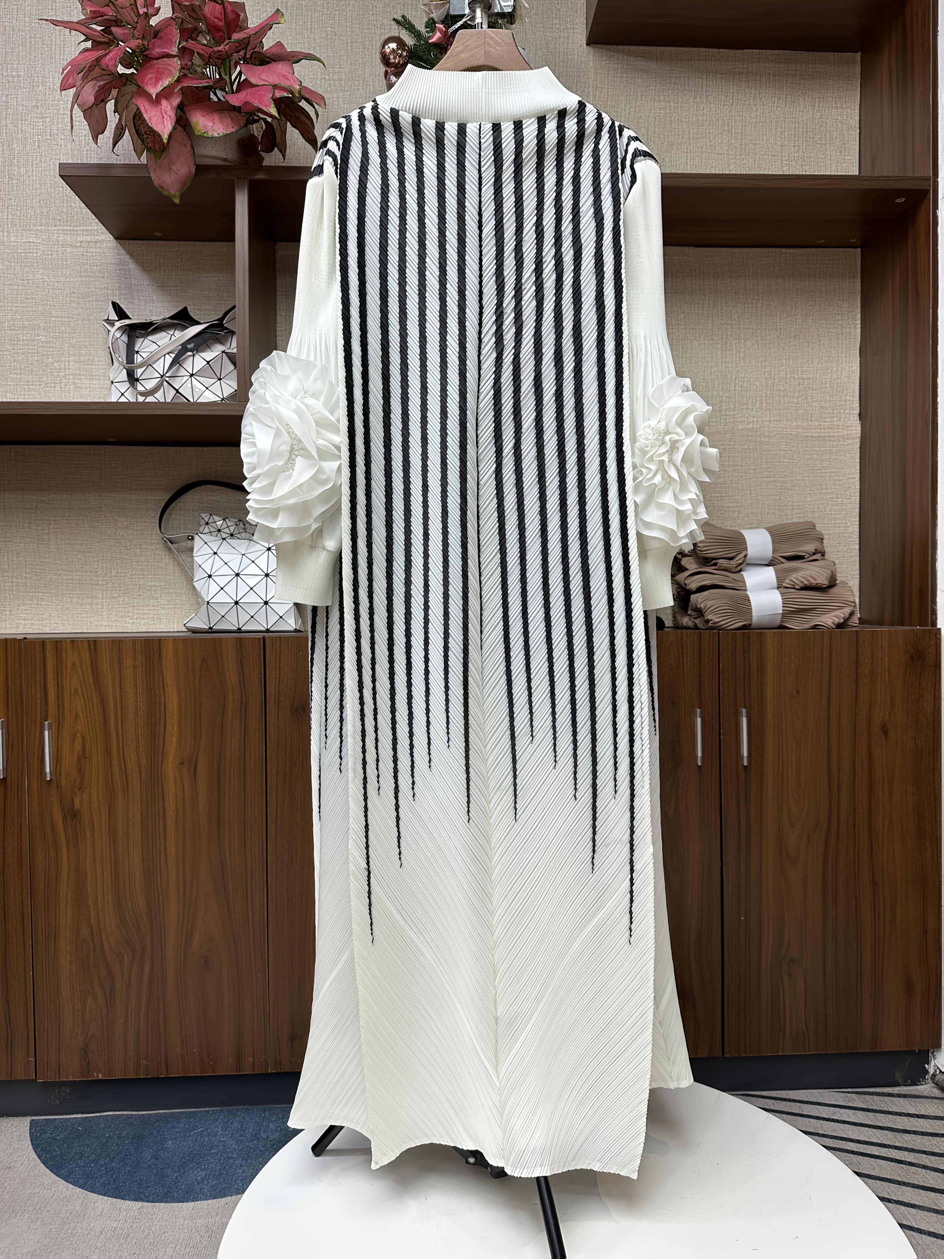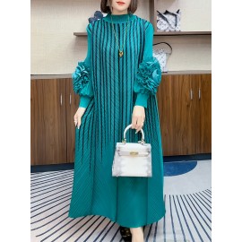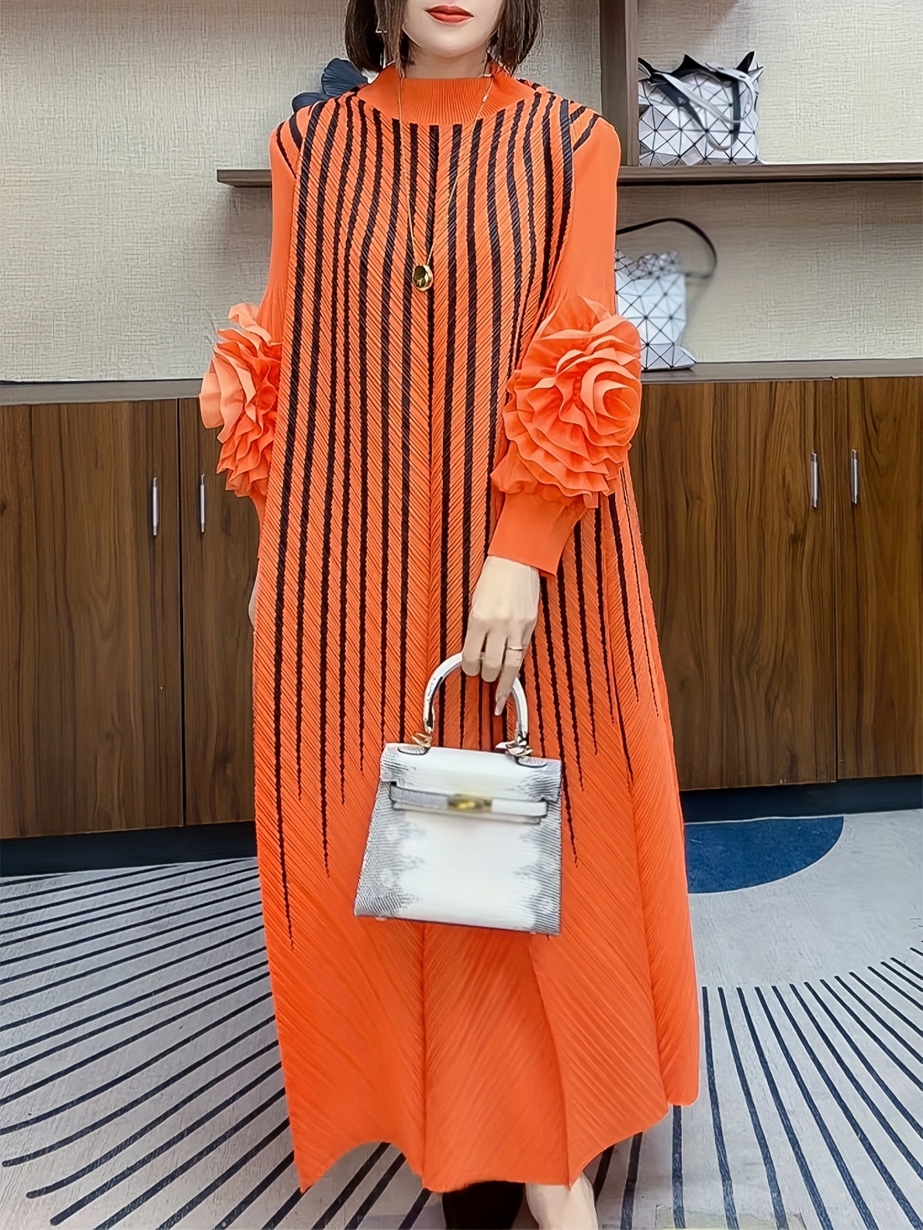 エレガントなオレンジストライプのマキシドレス(女性用)- スリミング長袖、フリルディテール、ポリエステル、洗濯機可、ラウンドネック - シックな中東スタイル、カジュアルエレガンス|シックなマキシドレス|複雑なデザイン