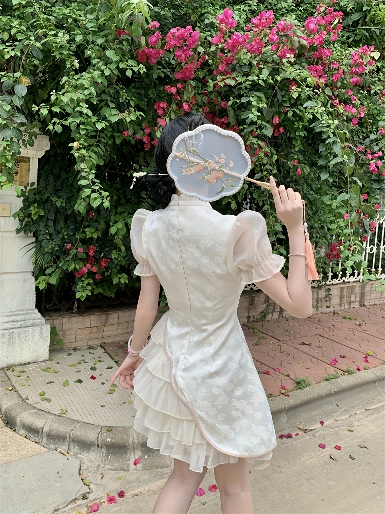 エレガントな新しい中国風チェンサムドレス、リボン付き - シュガーケーキスカートデザイン、半袖、マンダリンカラー、夏の女性ファッション、白色に黒い花柄